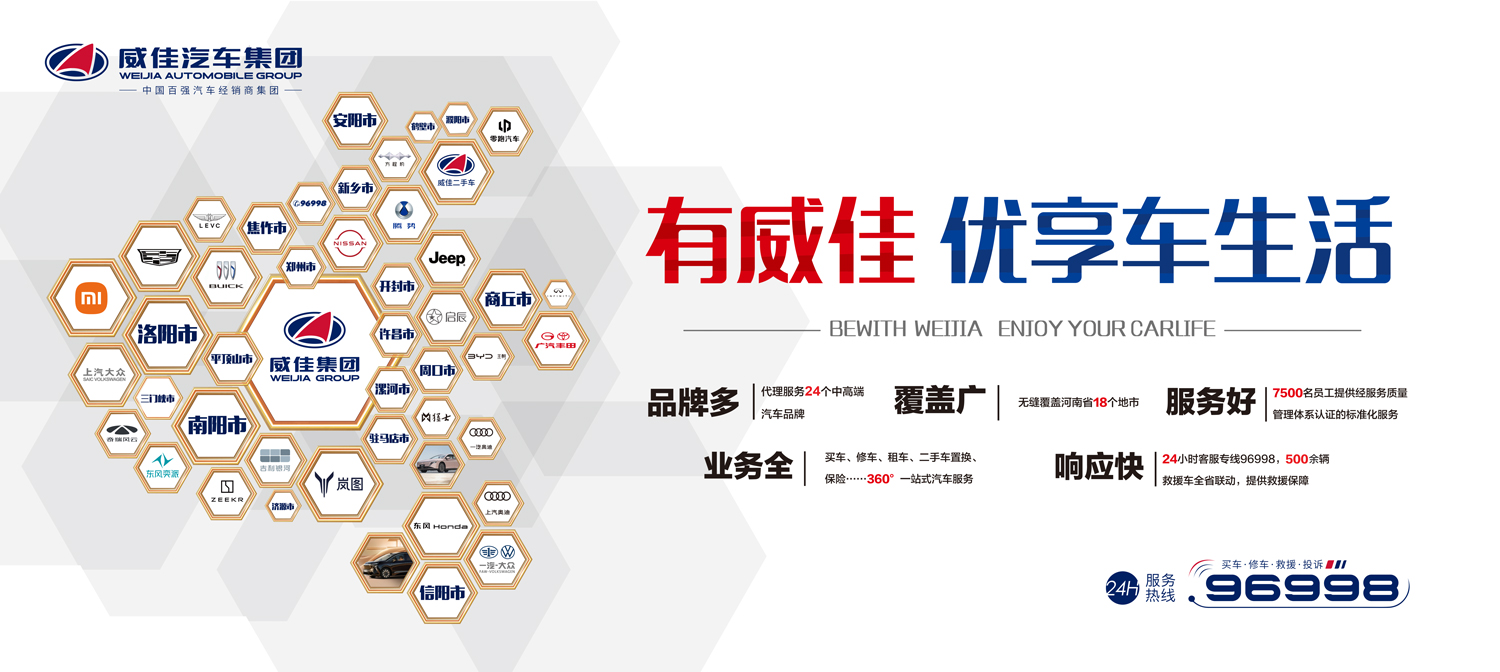威佳集团致力于为河南人民提供360°的专业汽车服务,打造河南汽车服务首选品牌。服务项目包括汽车销售、汽车维修、汽车金融保险、汽车装饰美容、汽车救援、汽车融资租赁、二手车交易等,为河南人民提供购车、用车、修车、换车的全方位服务。